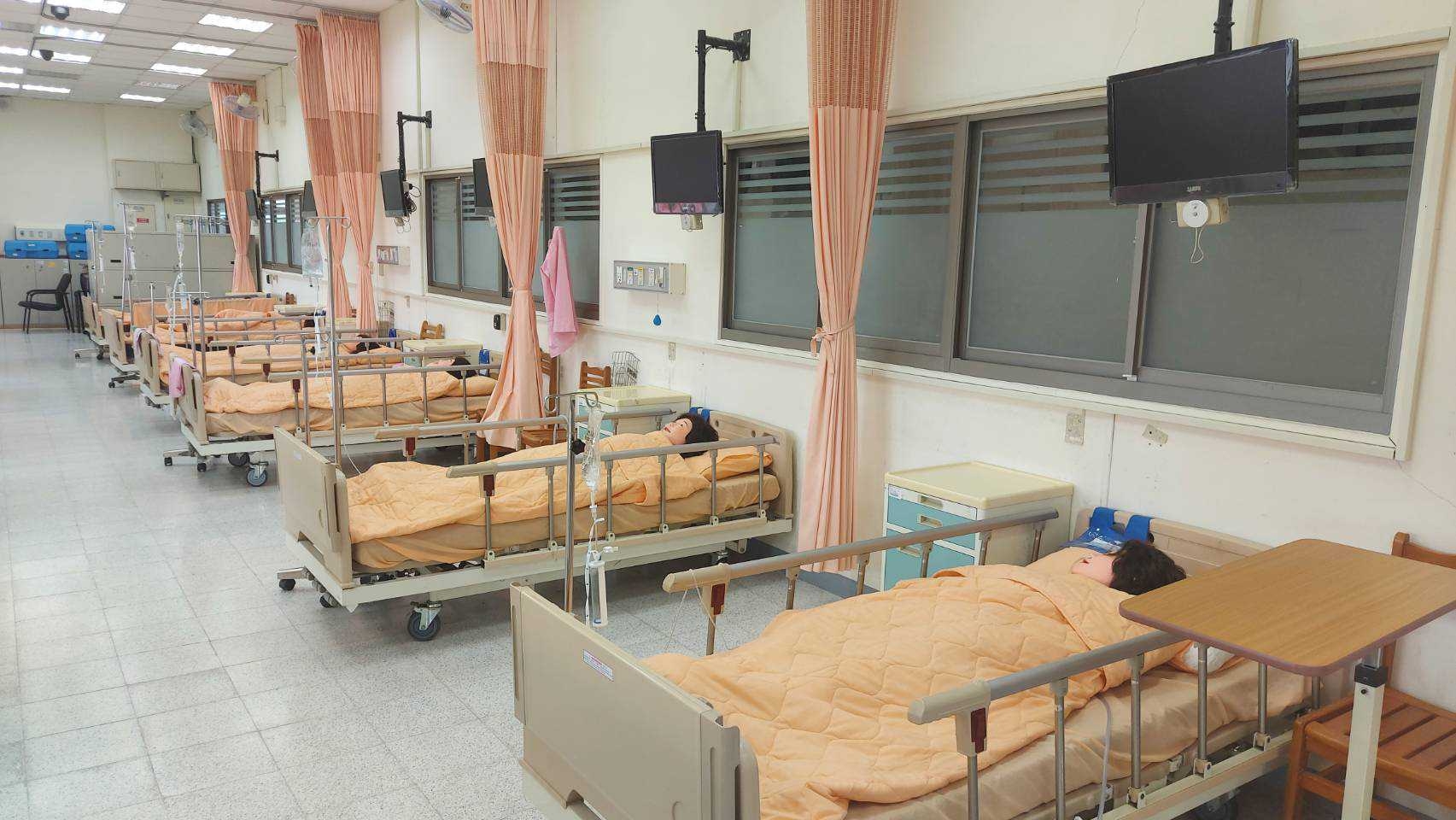階梯教室主要提供護理專業技術課程教學,教學區有示範床1張、護理假病人及階梯座位,同時配備有攝播影系統,可將技術示範過程同步投影至電視及大型螢幕,以利學生學習。