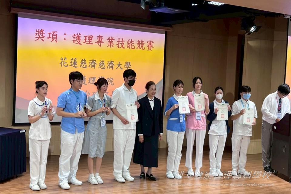 宜蘭校區護理科學生代表參加慈濟大學舉辦之「2025 第四屆大愛盃全國校際護理臨床實務技能競賽」,在全國13所技專院校激烈的競賽中展現紮實的專業知識與臨床操作能力。其中由 N553林家妃、林冠妤、陳妤湘以及 N554陳旻蓁所組成的團隊,以穩健的臨床判斷與默契十足的團隊合作,從眾多參賽隊伍中脫穎而出,榮獲「護理專業技能團體競賽」第3名,為校區爭取了極大的榮耀。此次佳績不僅肯定了學生們的努力與實力,也展現了宜蘭校區護理教育的卓越成果。