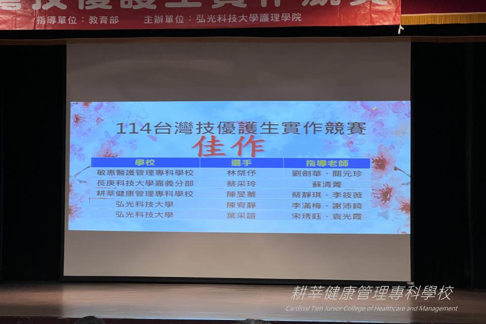 護理科學生陳旻蓁參加114年臺灣技優護生實作競賽榮獲佳作殊榮