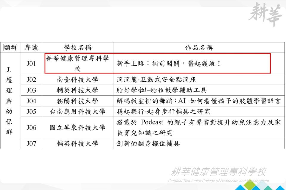 由教育部主辦「2026年全國技專校院學生實務專題製作競賽暨成果展」,本校護理科 護551劉鈞欣、王筑鈺、周秉毅及護554李欣庭、鄭伊廷同學,在指導老師金宥榛的專業帶領,以「新手上路:術前闖關,醫起護航!」作品參加「護理與幼保群」類群競賽,從全國69件作品中入選7件,脫穎而出、晉級決賽,值得肯定。