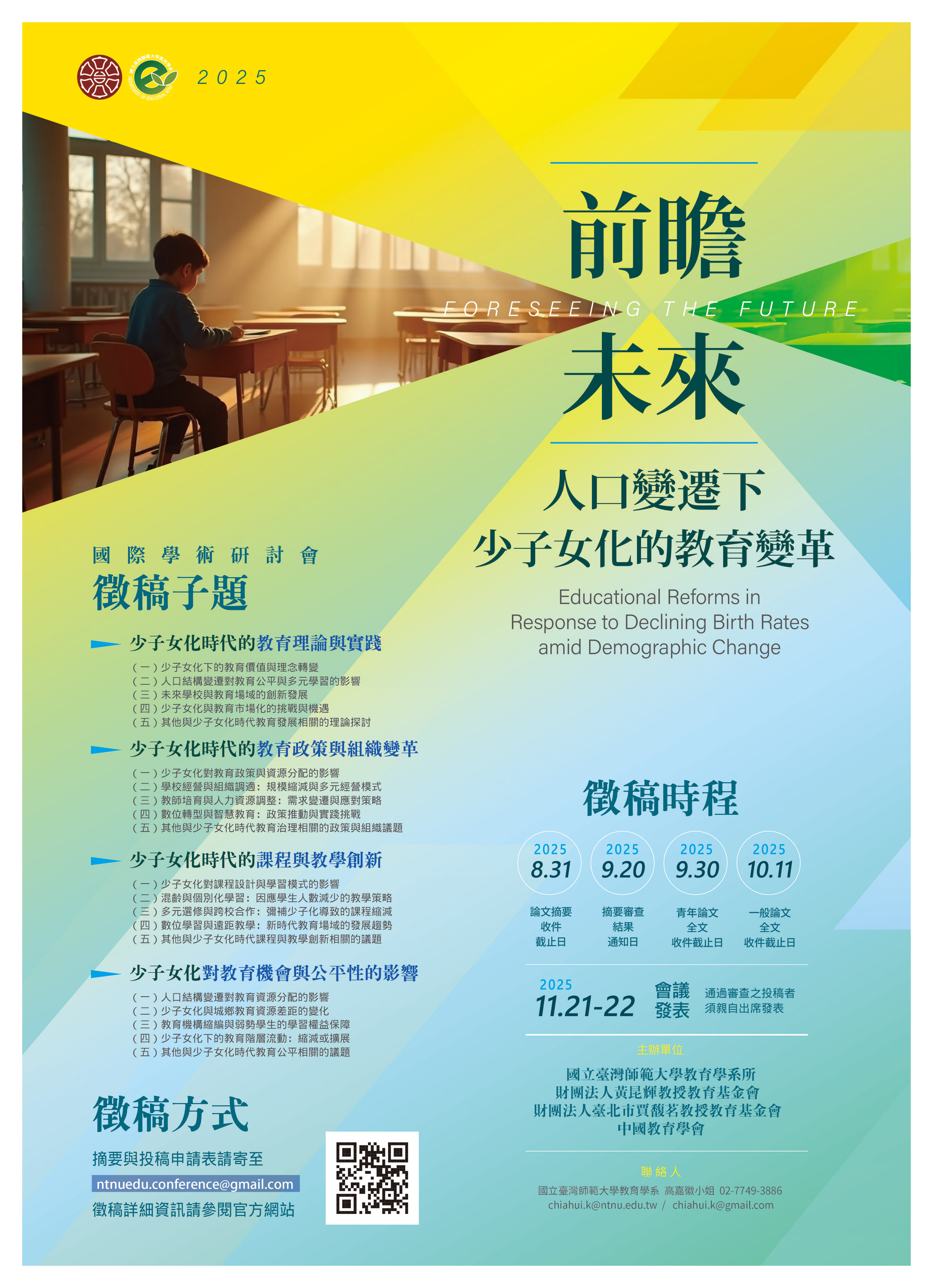 六、 隨函檢附徵稿啟事及投稿申請表(詳如附件),或請逕至臺師大教育學系網站查詢。有意投稿者請於2025年8月31日前提交投稿申請表與摘要,並以電子郵件寄至徵稿專屬信箱(ntnuedu.conference@gmail.com)。