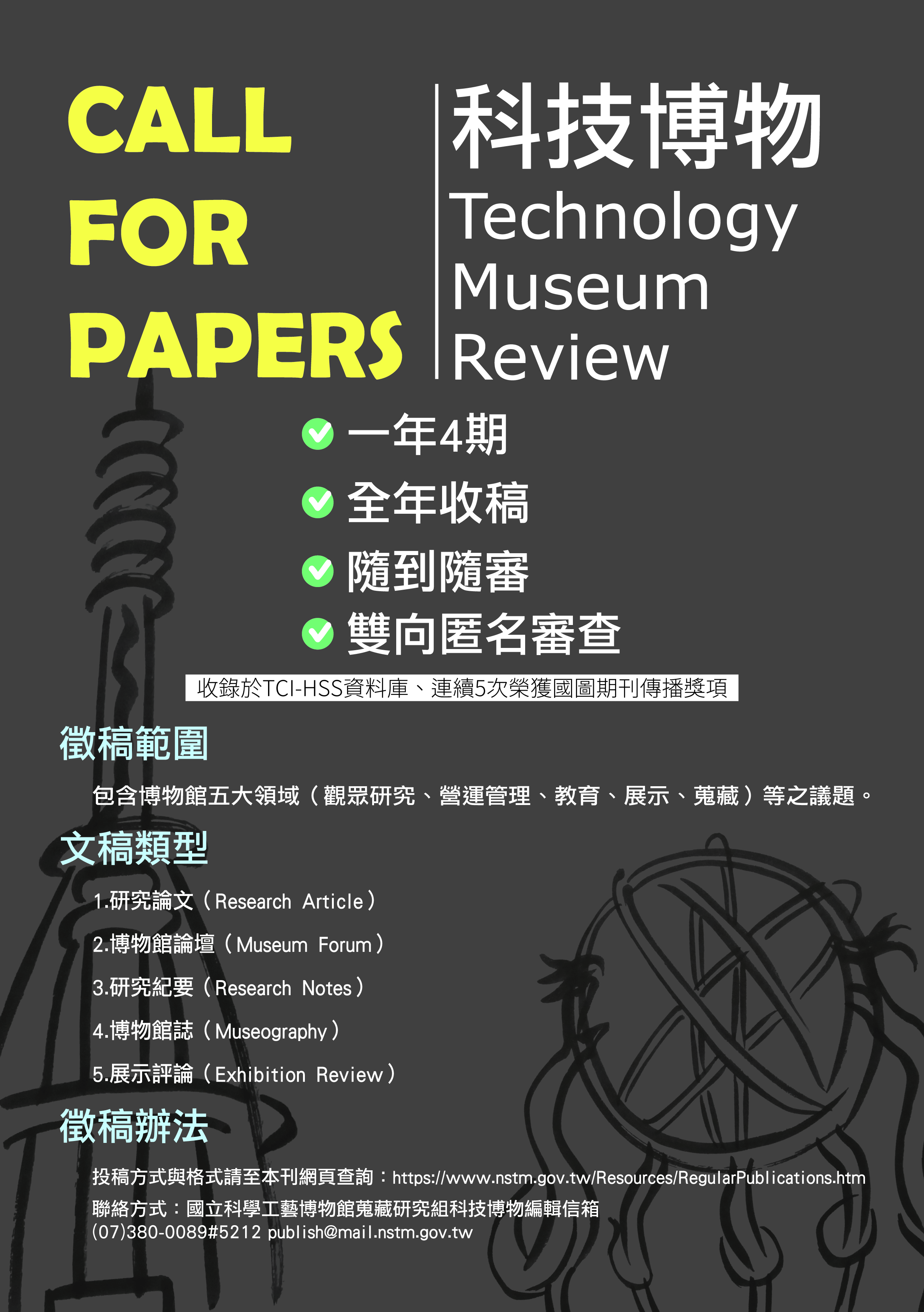 【公告內容】一、 科工館《科技博物》為「臺灣人文及社會科學引文索引資料庫」(TCI-HSS)所收錄學術期刊,具雙向匿名審查機制;徵稿範圍包含博物館五大領域研究:觀眾研究、營運管理、教育、展示、蒐藏(蒐藏管理、保存及文化資產理論與實務之研究)等之議題。每年3、6、9、12月各出刊1次,全年徵稿,文稿隨到隨審,歡迎踴躍投稿。
