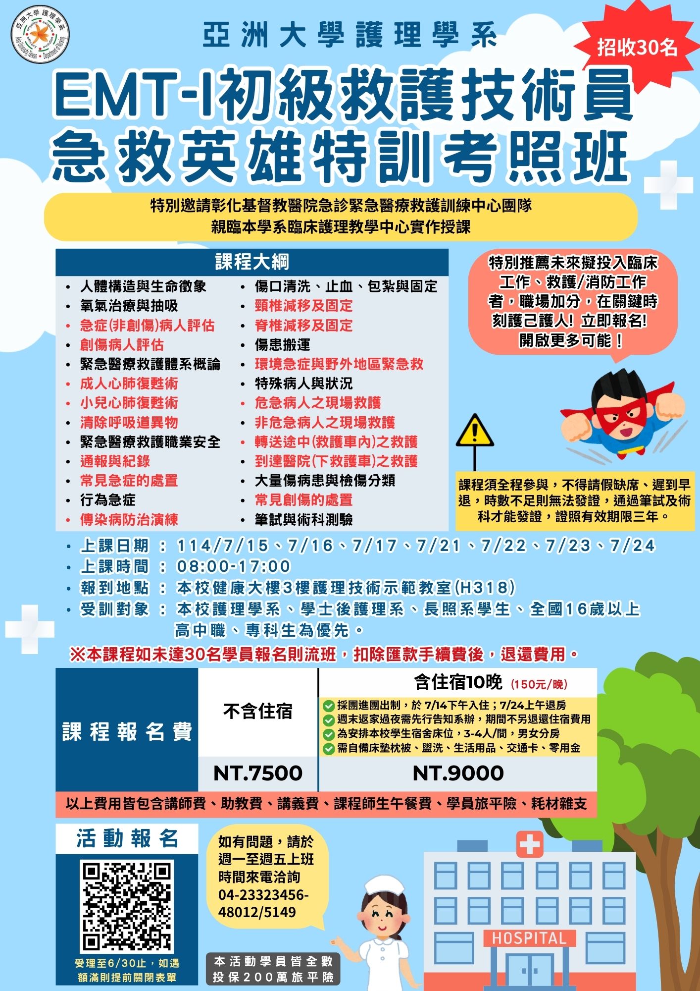| 外來文公告護理科亞洲大學護理學系EMT-1初級救護技術員考照班招生資訊...2025/04/092025/6/30 |